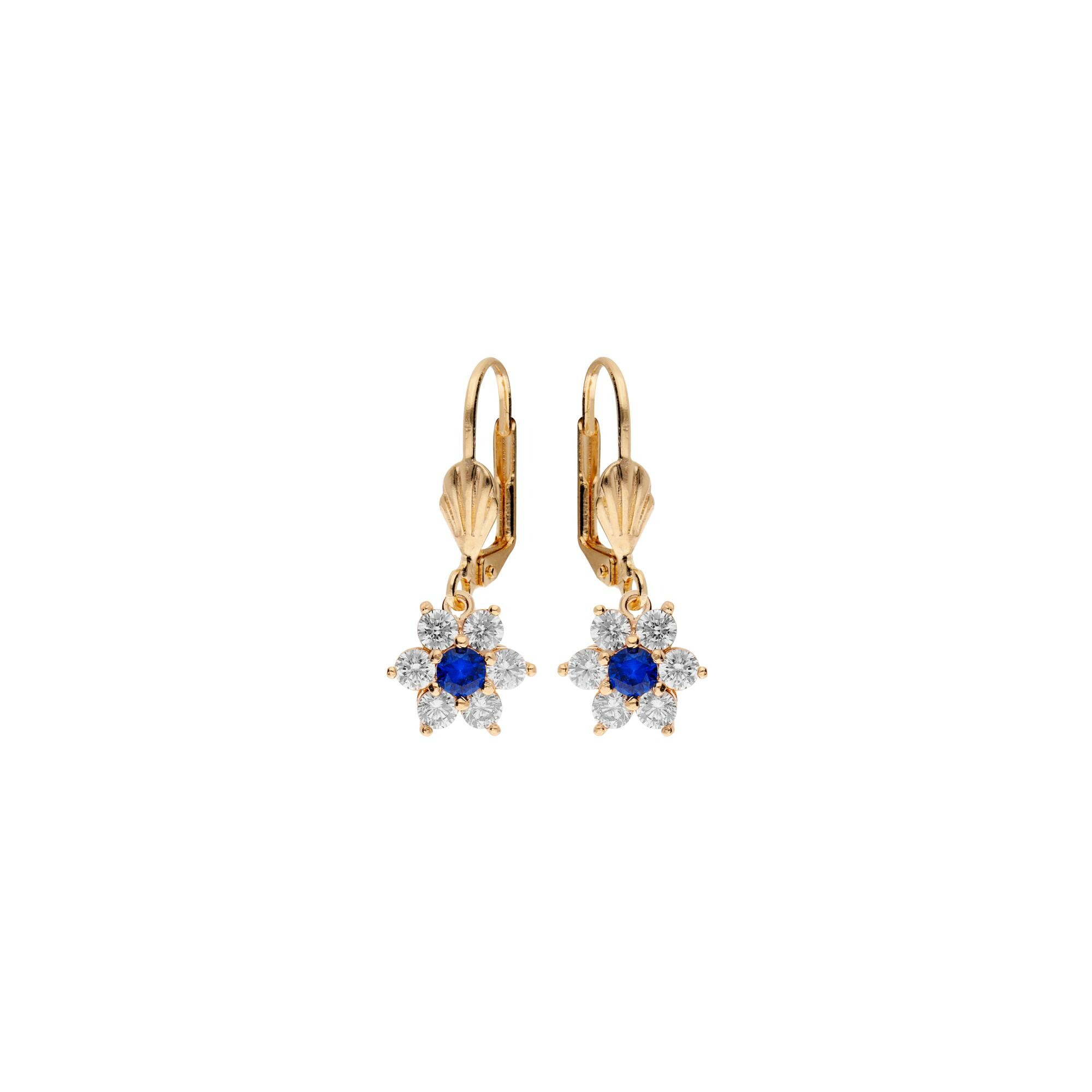 Boucles d'oreilles dormeuse plaqué or fleur marguerite oxydes centre bleu foncé et contour blancs sertis
