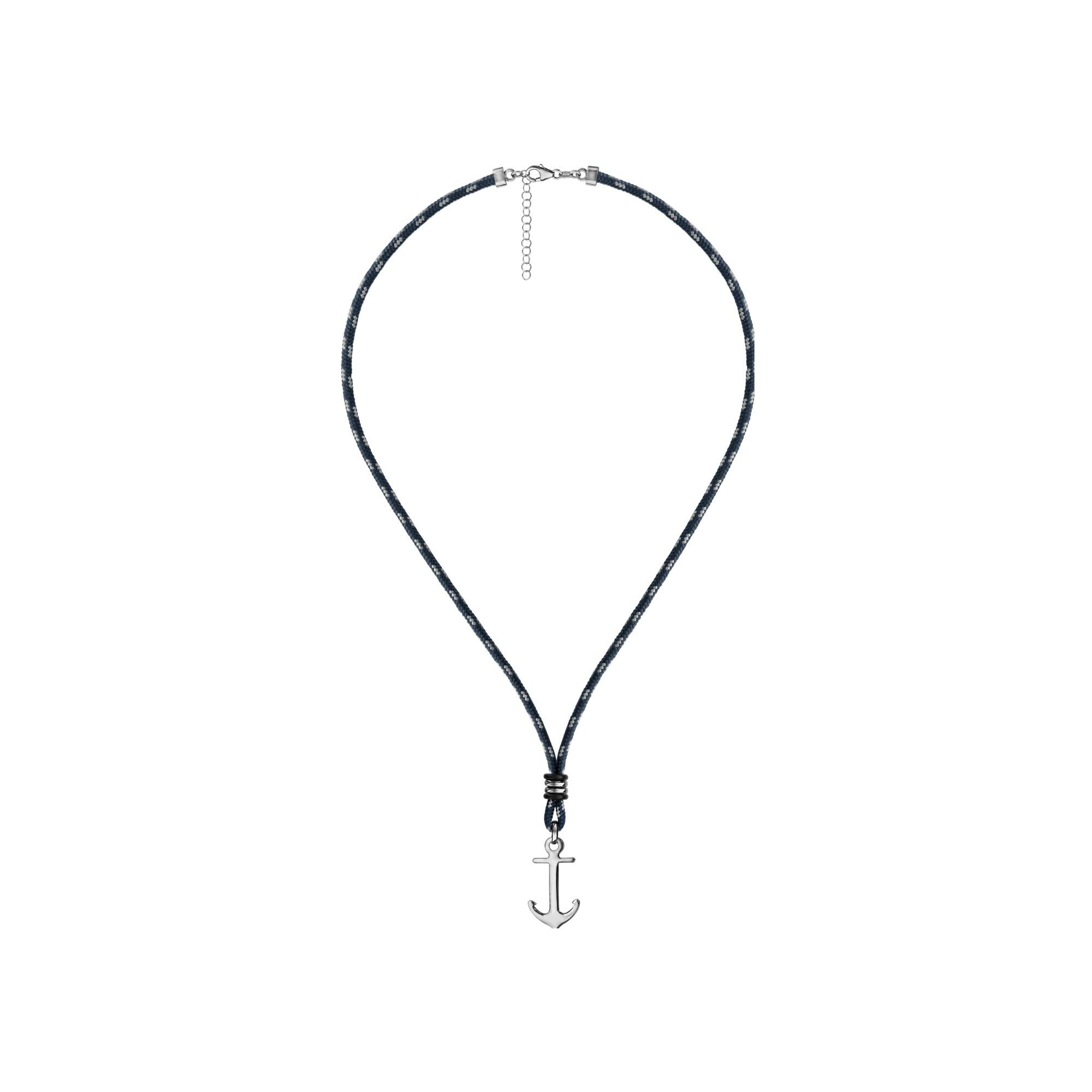 Collier argent rhodié corde bleue et blanches ancre marine 45+5cm